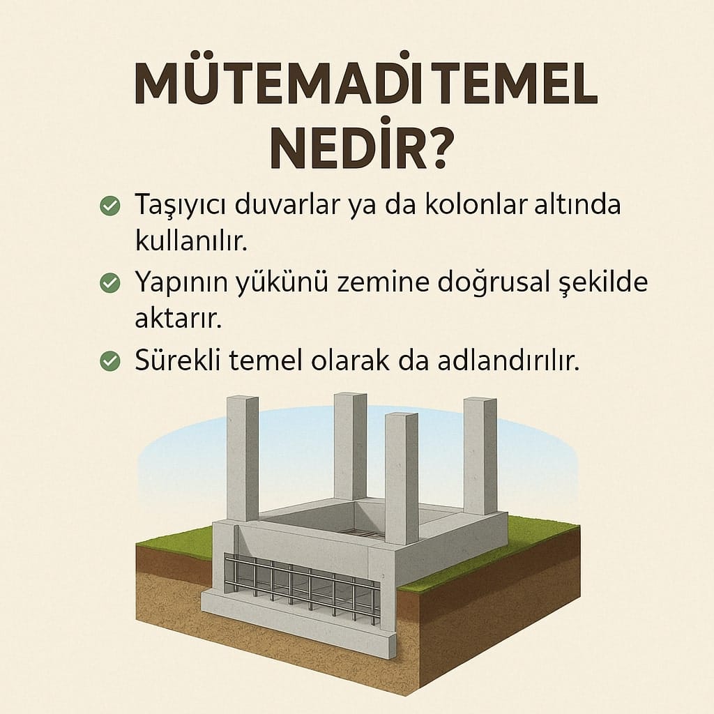 Giriş: Temelin Önemi Her bina, sağlam bir zemin üzerine oturtulmalıdır. Binanın yükünü zemine güvenli şekilde aktaran yapı elemanı ise temeldir. Temeller, statik hesaplara göre seçilir. Bu temel çeşitlerinden biri de mütemadi temeldir. Genellikle zemin koşullarının elverişli olduğu durumlarda tercih edilir ve geniş yüzeye yayılması ile bilinir. Mütemadi Temel Nedir? Mütemadi temel, yapıdaki taşıyıcı duvarların ya […]